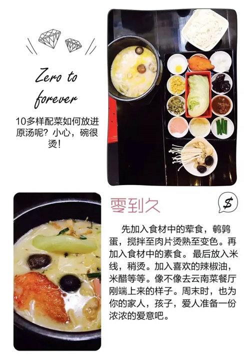 ③忌最后吃荤食:吃米线时要先吃荤,才能保持在最滑嫩最鲜美的时候入口。然后米线,最后喝汤。等食材基本食净,汤的温度也已经降到适宜入口了。