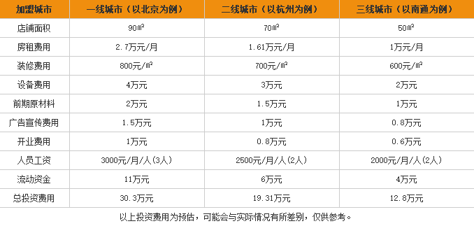从上面的表格中我们能看到刘福记桂林米粉加盟费的情况,一线城市的加盟费用为30万元左右,二线城市加盟费为19万元左右,而三线城市的加盟费为12万元左右。