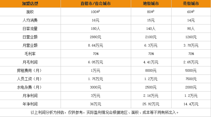 通过上表可以知道,省会城市鲁湘缘米粉加盟店一个月能有3万元左右的净收入。地级城市鲁湘缘米粉加盟店一个月能有2.1万元左右的净收入。县级城市鲁湘缘米粉加盟店一个月能有1.2万元左右的净收入。