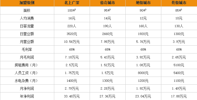 通过上表可以知道,省会城市纳家米粉加盟店一个月能有2.2万元左右的净收入。地级城市纳家米粉加盟店一个月能有1.9万元左右的净收入。县级城市纳家米粉加盟店一个月能有1.4万元左右的净收入。