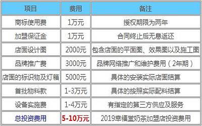目前投资开一家幸福堂奶茶加盟店的初步成本预计在5-10万元之间,其中包括了幸福堂奶茶品牌加盟费1万元、保证金1万元、设备费用1万元-4万元等等,总计5-10万元。