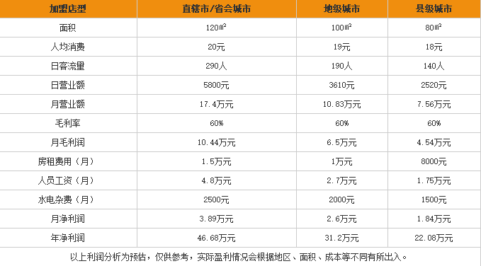 通过上表可以知道,省会城市鑫咏和过桥米线加盟店一个月能有3.8万元左右的净收入。地级城市鑫咏和过桥米线加盟店一个月能有2.6万元左右的净收入。县级城市鑫咏和过桥米线加盟店一个月能有1.8万元左右的净收入。